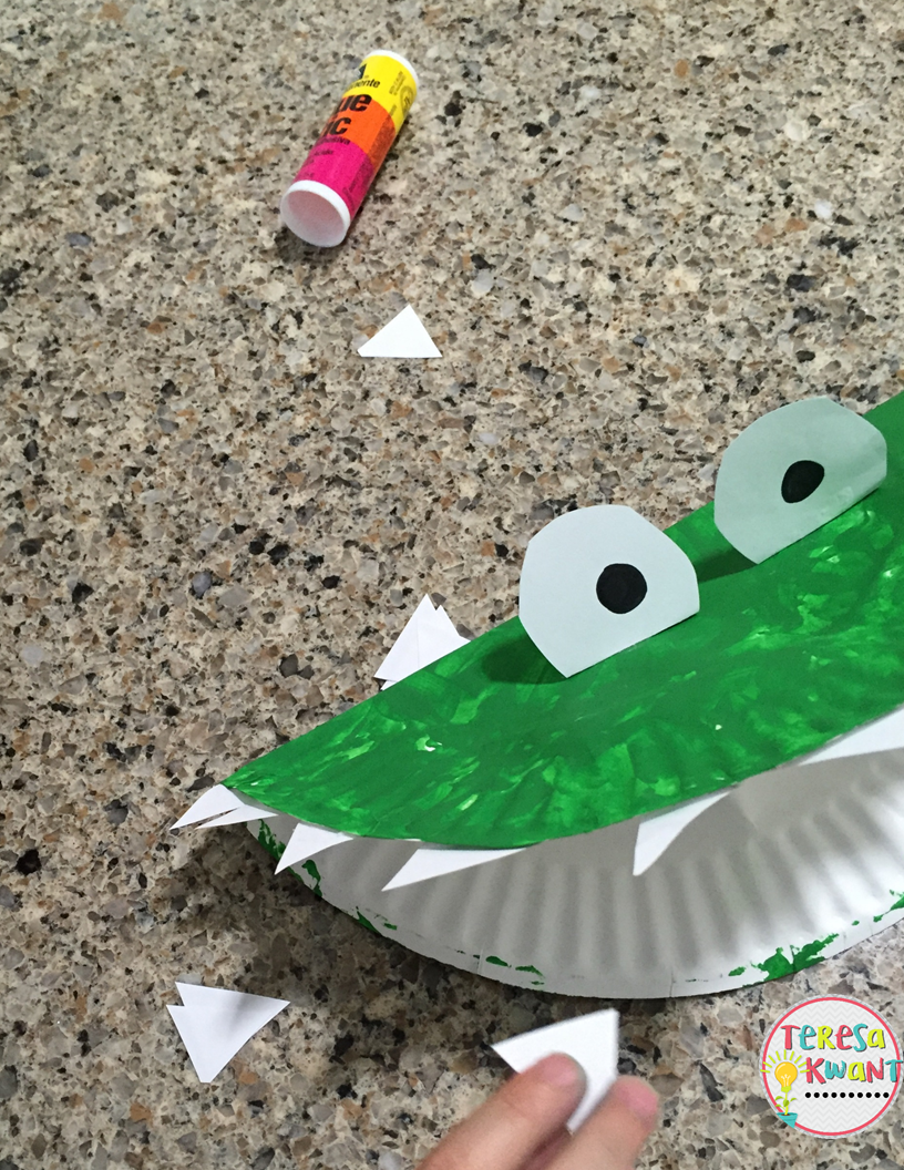#3 Next we made an alligator paper plate craft. It was very simple, and my son did the majority of the work (minus the cutting of the teeth, which he probably could have done anyway). First we painted paper plates green. It just so happened that I couldn’t find any paintbrushes so we finger painted them, and it was a lot less messy than I anticipated. After the paint dried, we added eyes and teeth. Ta-Da!