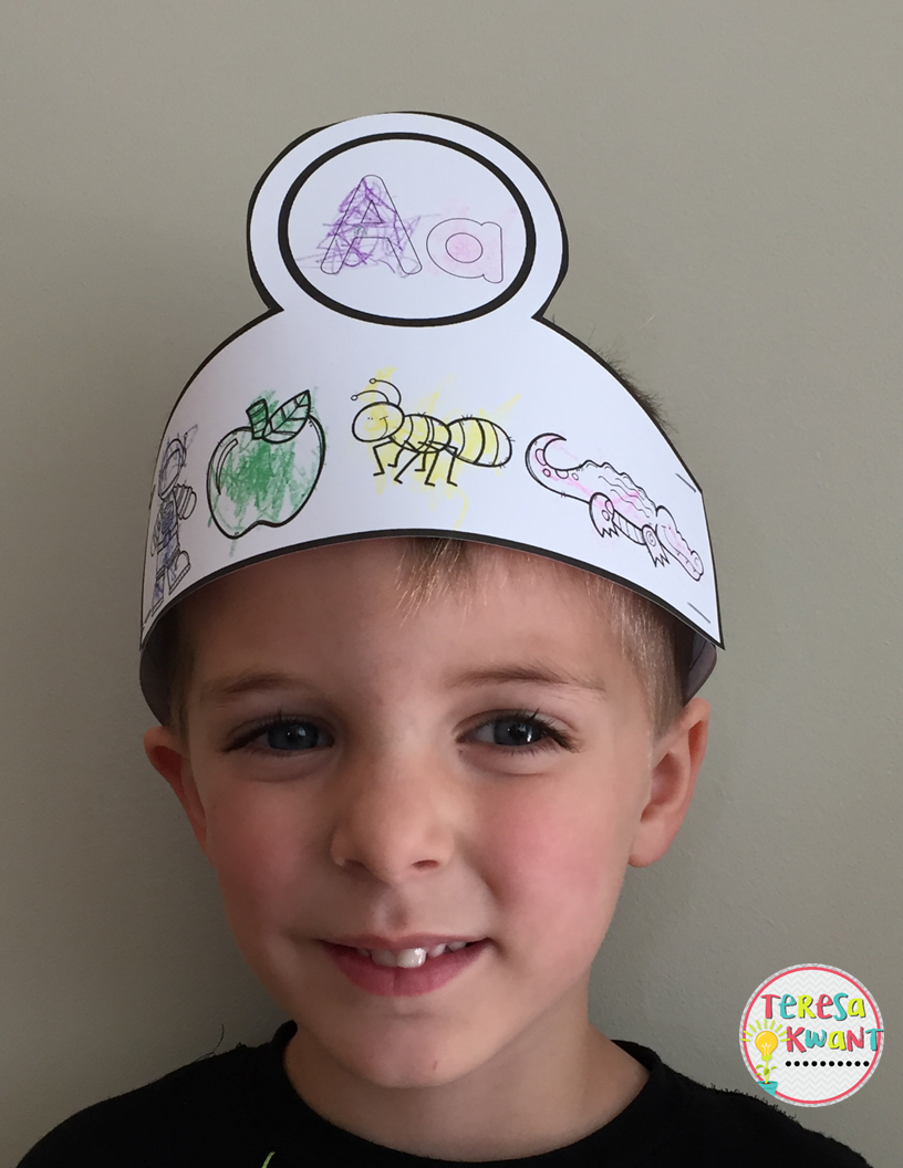 #2 Next we made this cute letter A crown. We practiced how the alligator, ant, apple, and astronaut all started with A. Together we worked on the short A sound. The band around the crown allowed for letter tracing practice.